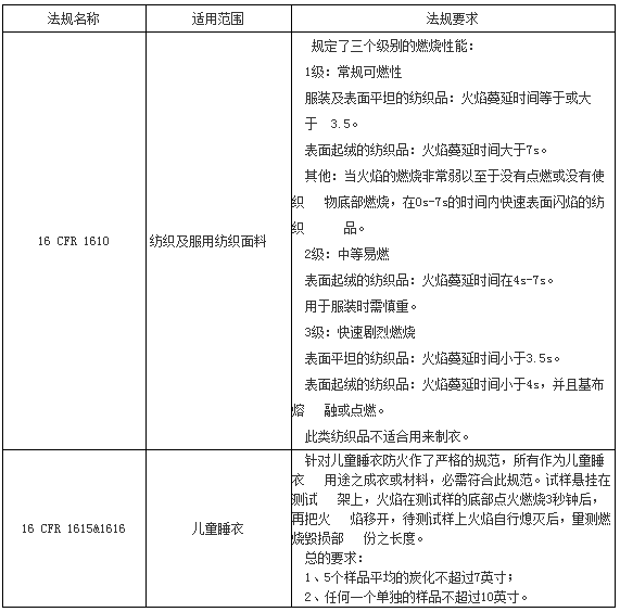 This page focuses on the U.S. burning regulations for textiles and clothing: 16 CFR 1610 for textiles and clothing, 16 CFR 1615 & 1616 for children's pajamas; Details of the regulations are as follows: